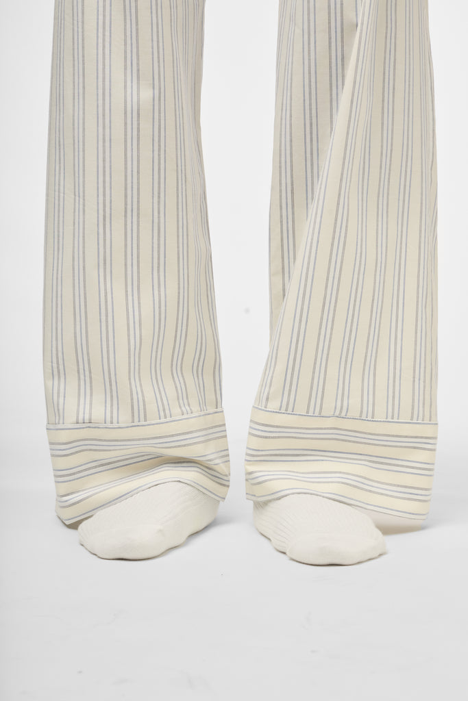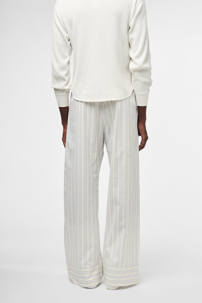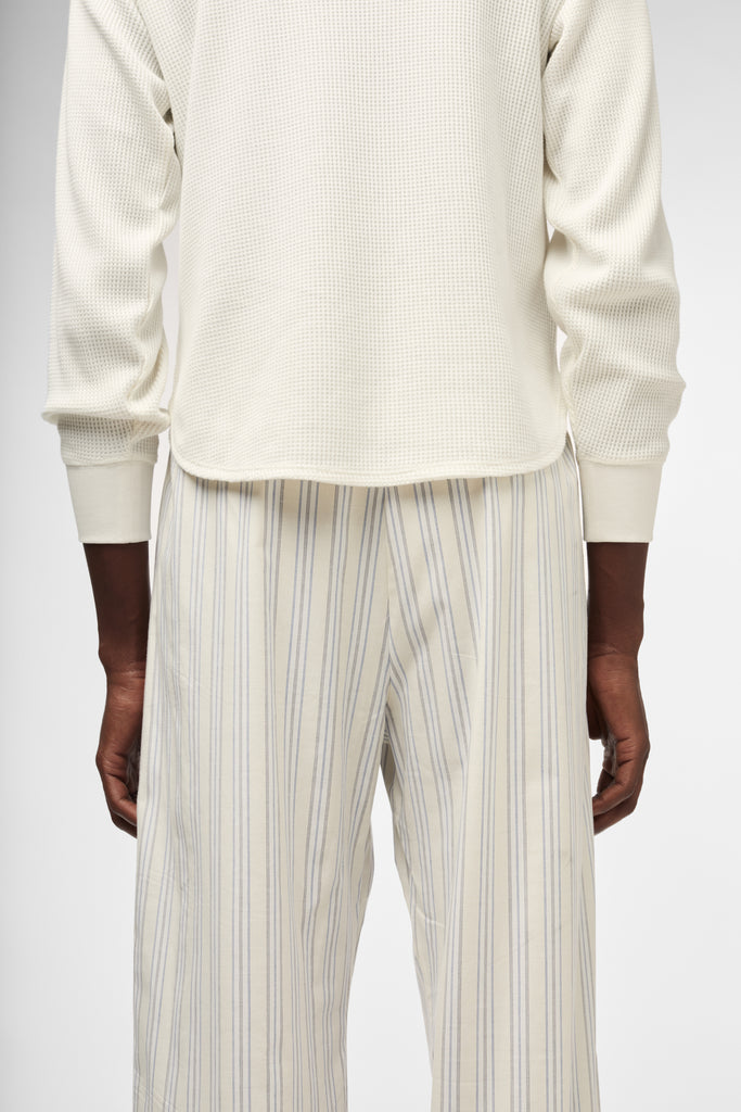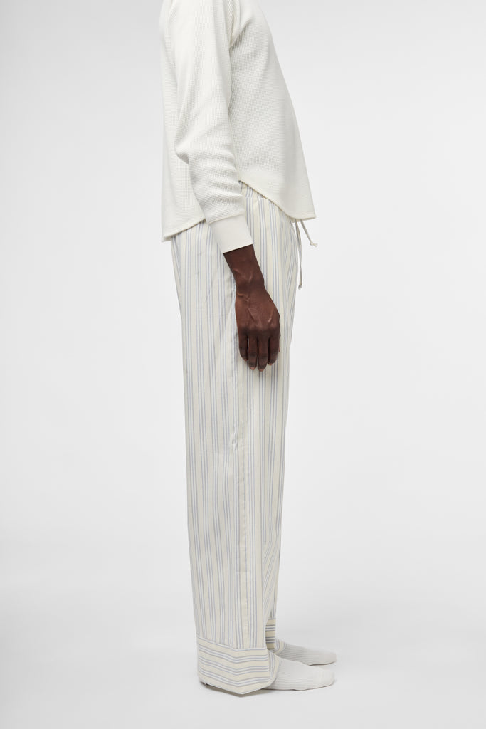 Our perfect everyday pant is made from lightweight cotton for a relaxed, boxy fit. This unisex pant offers the comfort and ease of pajamas, reimagined for daytime wear in a polished poplin stripe. Each style is crafted from deadstock materials, meaning every piece we produce is in limited quantities, and no color is reproduced.